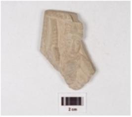 | Description / विवरण | Human figurine on relief portion below waste broken, head have headdress, two eyes, nose and lips visible, necklace on neck, hand and portion of left arm visible. |