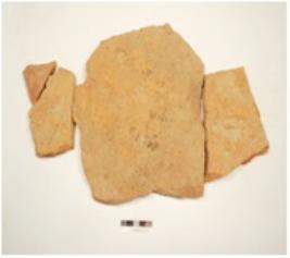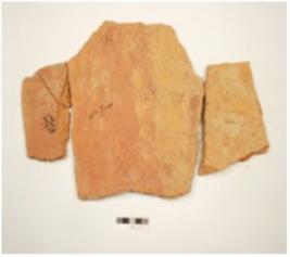 | Description / विवरण | Fragment of a handmade terracotta floor tile, coarse fabric husk impression, red slipped, broken from all sides, which are missing. |