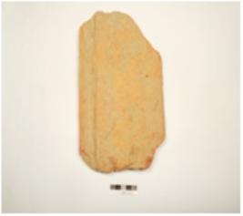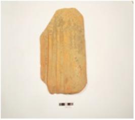 | Description / विवरण | Fragment of a handmade terracotta roof tile, coarse fabric, with channel shape depress series on surface. |