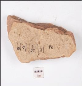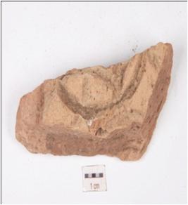 | Description / विवरण | Fragment of a tile of dull red ware, with petals, curved design on the outer surface. |