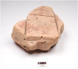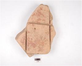 | Description / विवरण | Fragment of tile, well baked, medium fabric, with horizontal and vertical grooved lines, forming one squars on shaped decorative within grooved lines others are broken, lower part is uneven. |