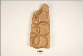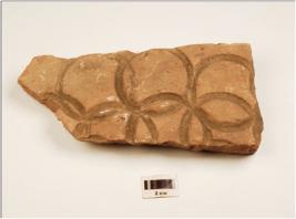 | Description / विवरण | Fragment of terracotta tile with partly rectangular shaped, grooved converging circular line on surface. |
