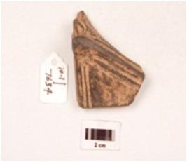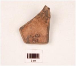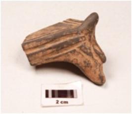 | Description / विवरण | A fragment of a votive tank, grey in colour, moulded, parallel bands on the base and on the sides, petal like design on the handle. |