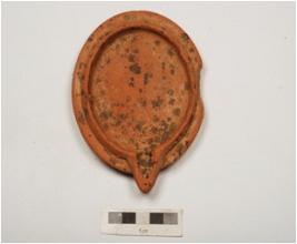 | Description / विवरण | Terracotta lamp, circular in shape, slightly inturned rim, thick ridges, shellow, wick intact slightly broken edges and wash treatment given in dull red colour. |