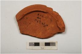 | Description / विवरण | fragment of terracotta lamp. Circular in shape, slightly inturned rim, shellow, wash treatment given in dull red colour and disc base. |