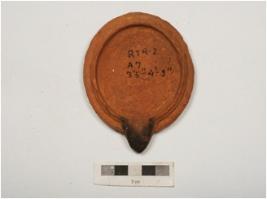 | Description / विवरण | Terracotta lamp. Circular in shape, slightly incurved rim disc base wick is intact and wash treatment given in red colour. |