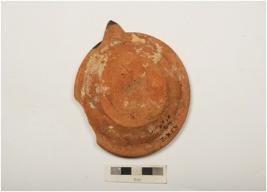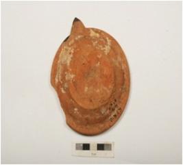 | Description / विवरण | Terracotta lamp. Circular in shape, slightly incurved rim, slightly broken edges, wick is intact, wash treatment given in dull red colour and disc base. |