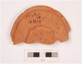 | Description / विवरण | Fragment of terracotta lamp with smooth surface thickened rim with intact wick visible. |