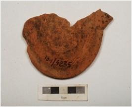 | Description / विवरण | Fragment of terracotta earlthen lamp, circular in shape, slightly inturned rim, thick ridges, black pigmentation visible on reverse side, wash treatment given on dull red colour and disc base. |