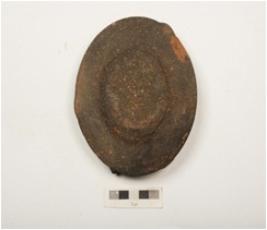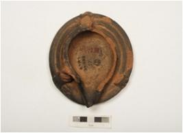 | Description / विवरण | Fragment of terracotta lamp circular in shape. Slightly inturned rim but broken. Wick is slightly chipped off, edges decorated with grooves lines and applique human legs. Slip treatment given in black colour. |