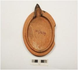| Description / विवरण | Terracotta lamp. Circular in shape, slightly incurved rim, slightly broken edges, wick is intact, wash treatment given in dull red colour and disc base. |