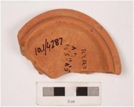 | Description / विवरण | Fragment of terracotta lamp with smooth surface and thickened rim visible. |