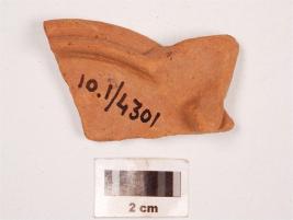 | Description / विवरण | Fragment of terracotta lamp with smooth surface and shallow base and the rim with wick visible. |