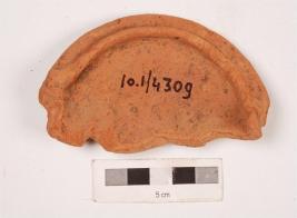 | Description / विवरण | Fragment of terracotta lamp with smooth surface thickened rim with intact wick visible. |