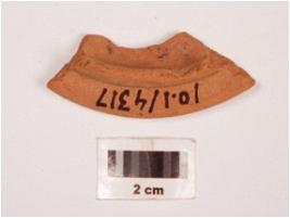 | Description / विवरण | Fragment of terracotta lamp with smooth and shallow surface and thickened rim visible. |