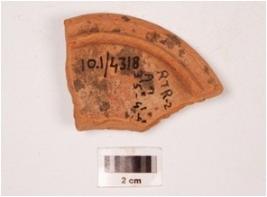 | Description / विवरण | Fragment of terracotta lamp with smooth and shallow surface and thickened rim visible. |