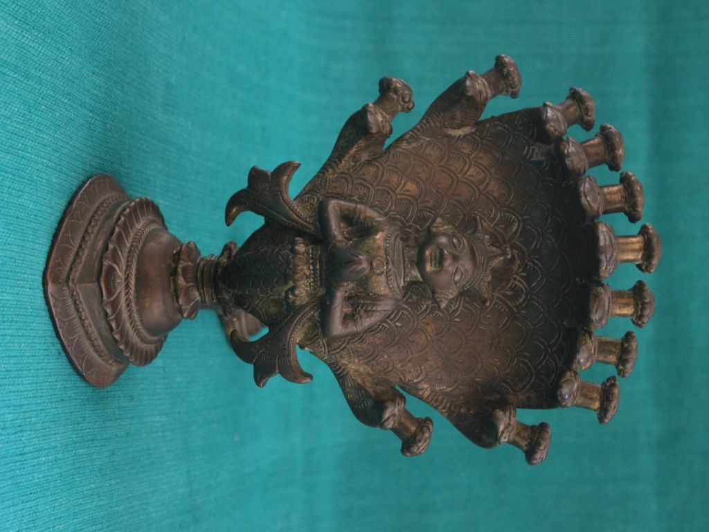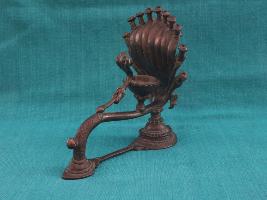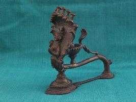 A silver lamp in the form of Nag with his fangs open.The nag is hown with many mouths. The lamp is badly rusted and some part is missing as well.