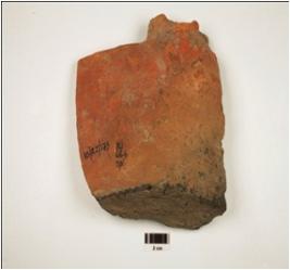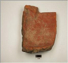 | Description / विवरण | A fragment of votive tank of red ware, has an elongated profile flat base, treated with red slip, of coarse fabric, and ill baked. |