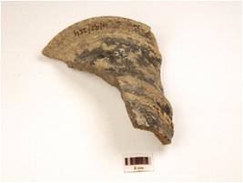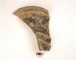 | Description / विवरण | Fragment of finail of grey ware, treated with black slip on the exterior, and incised ridges on the exterior. |