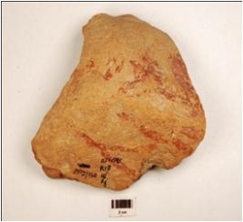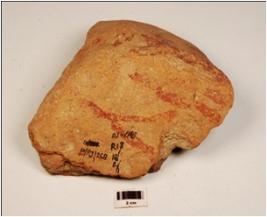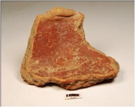 | Description / विवरण | Fragment of rectaugular votive tank of red ware, treated with red slip inside has indeterminate pattern in applique on the top. |