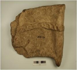 | Description / विवरण | Fragment of an votive tank of grey terracotta,decorated with finger and thumb depression on the applique band,has a foot base and uneven surface, coated with a mixture of lime and kanker. |