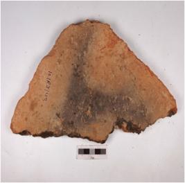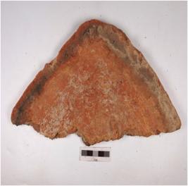 | Description / विवरण | Fragment of terracotta votive tank broken sides, flat base and treated with red slip. |