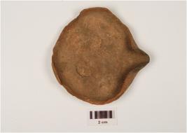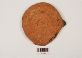 | Description / विवरण | A beaked lamp of red ware, has up raised edge and flat base. |