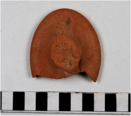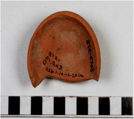 | Description / विवरण | A fragment of a earthern lamp of red ware with incurved rim, button base, of medium fabric. |