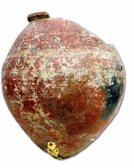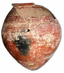 | Description / विवरण | Broken red ware pyriform shaped urn pot with thick splayed out rim, pointed base, a pair of chevourn design bands on the body, a deep groove below the neck. |