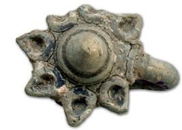 | Description / विवरण | Black ware Sapta harathi lamp stand with projected knob at the centre and a looped handle on one side. |