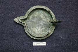 | Description / विवरण | It is oval shaped with a flat bottom. The lamp is well designed with a projected single wick holder. The die struck lamp has a beading in the outer edges to enable it to be hung as a hanging lamp. The most important feature of the lamp is the presence of a cock at the opposite side of the wick in the same orientation. There are two big and two small hook-like projections in the top of the lamp. The cock is intricately carved with its circular tail. The beak and feathers of the cock are shown prominently. |