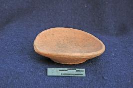 | Description / विवरण | A shallow lamp of dull red ware with a featureless rim and disc base. It has no groove for wick. |