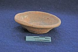 | Description / विवरण | A lamp of dull red ware with featureless rim and thick disc base. It has no groove for wick. |