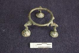 | Description / विवरण | It has three curved legs luted through a prominent triangular projection to the circular ring at the top. Each leg is flanked by a small projection on either side. It is about 3.6cm, in height with a width of 6cm. |