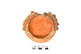 | Description / विवरण | Red ware Lamp with round in shape with beaded rim. Wick portion is broken .Decorated design on either side of the wick portion is noticed |