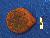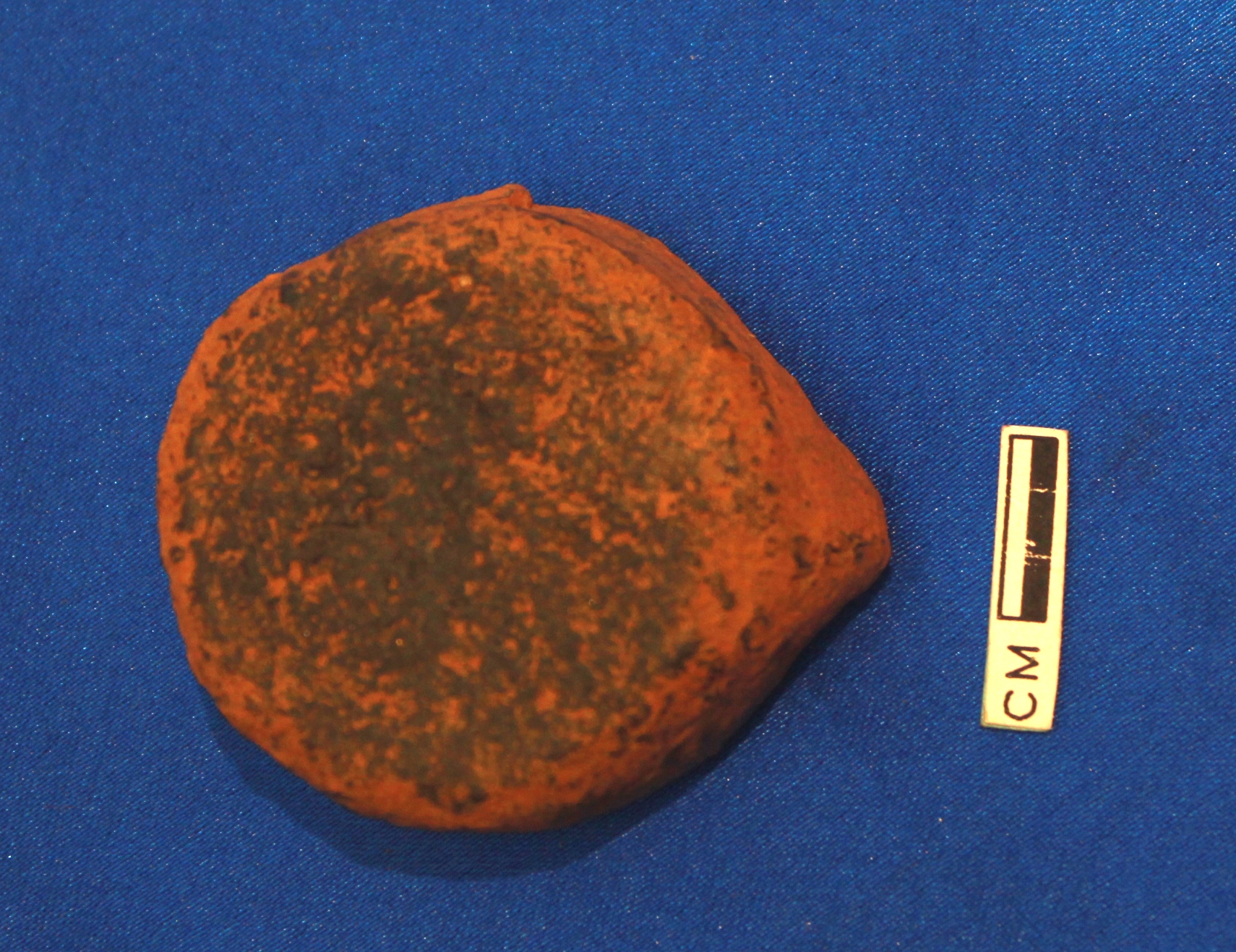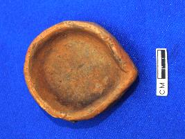 Small lipped terracotta lamp with a black color on the back side. It is fine grained and well fired.