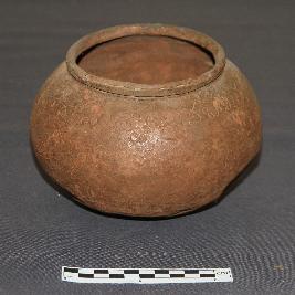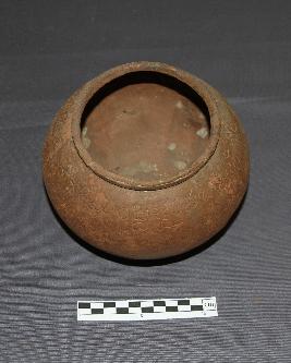 | Description / विवरण | Globular-shaped pottery made of copper with a rim. It has a single-line Telugu inscription engraved below the rim portion. The bottom has some holes due to corrosion. |