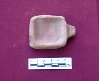 A rectangular ladle of red fabric with shor thick handle having a greve on its wppersurface is meant for giving offering in the fire altar.Scar mark can be seen on the front side.Hand modelled.