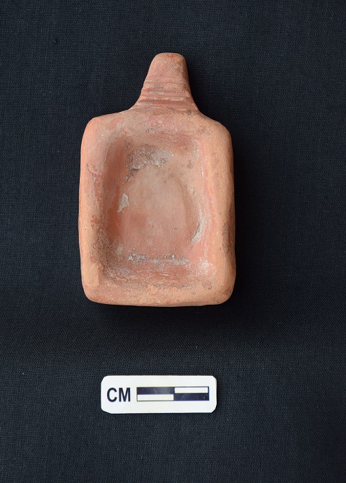 A rectangular ladle of red fabric with short handle having three groove for better grip is meant for giving offening in to fire, Hand modelled