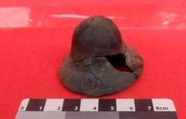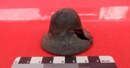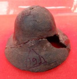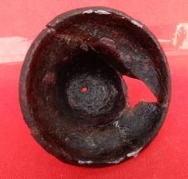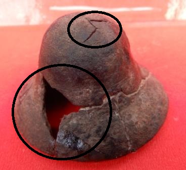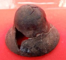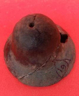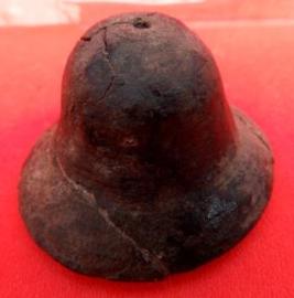 A small cup-shaped bell with a flaring mouth which is made of copper. The pendulum of the bell is missing.