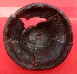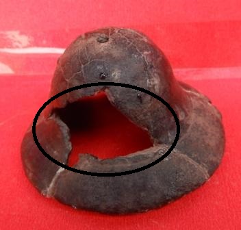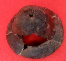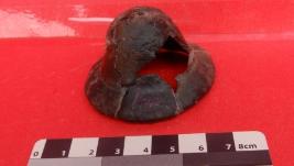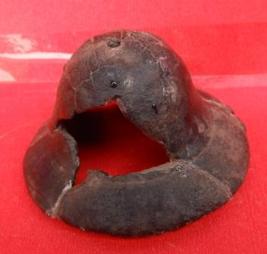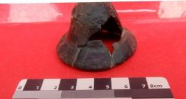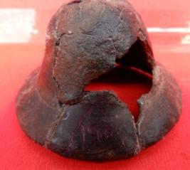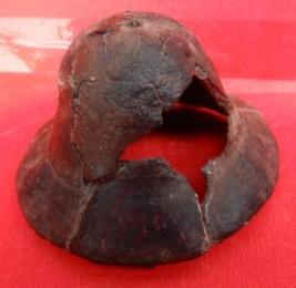 A small cup-shaped bell with a flaring mouth which is made of copper. The pendulum of the bell is missing.