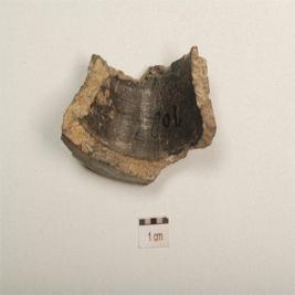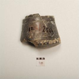 | Description / विवरण | Fragment of a casket made on sope stone with partly broken rim and broken flat base, polished surface with incised circular lines and gray in colour. |
