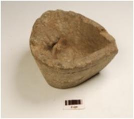 | Description / विवरण | A lamp made of soapstone, triangular in shape, everted rim and cracks on the surface. |