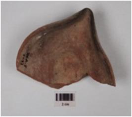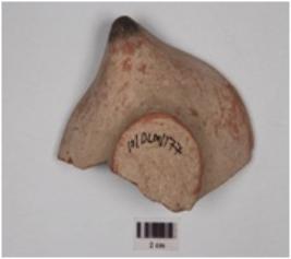 | Description / विवरण | A fragment of an offering lamp of dull-red ware with beak, disc base, treated with creamy slip both side and of medium fabric. |