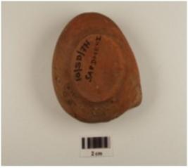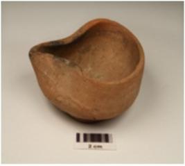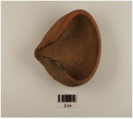 | Description / विवरण | A beaked offering lamp of red ware treated with red slip on the exterior, has a featureless rim,convex profile and disc base. |