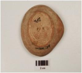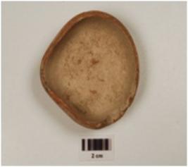 | Description / विवरण | A beaked lamp of red ware, treated with red slip on the both surfaces has incurved rim, convex profile, and disc base. |