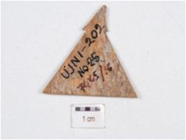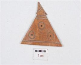 | Description / विवरण | Fragment of a mother goddess, made of bone, upper half broken, triangular in shape with incised linear & circular with dot and polished surface. |