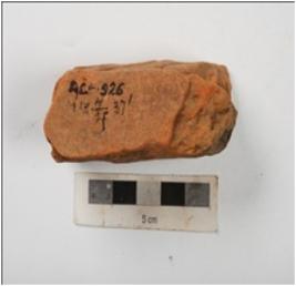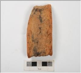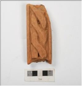 | Description / विवरण | Fragment of handmade terracotta plaque, surface decorated with weavy design, thick in character, wash treatment given on surface in red colour. |