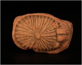 | Description / विवरण | Terracotta fragment of a round plaque showing a chakra hole aloft in vishnu s left hand with spokes and red in colour. |