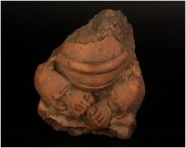 | Description / विवरण | Terracotta plaqued fragment of kuber diety, pot belly, intacted feet, seated on pedestal, wearing drappery. Upper portion is missing and red in colour. |